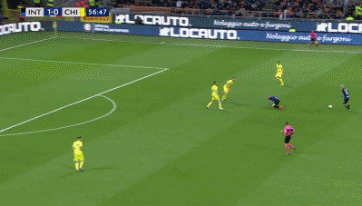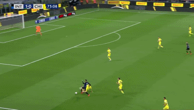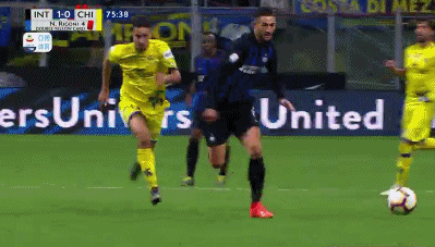 The ball is bouncing around and Politano is the first to react as it rolls into a lot of space. He takes it around the defender with his first touch and then takes his shot from outside the box.