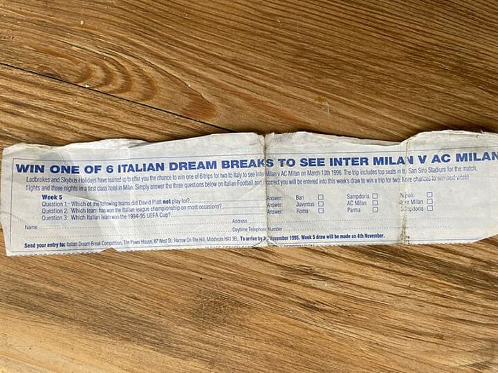 Anyway, that coupon was a pre-Internet treasure trove of information - fixtures on the front, league tables and top scorers on the back. But one Saturday afternoon, in October of 1995, I found a competition overleaf - ‘Win one of 6 Italian Dream breaks to see Inter Milan v AC Milan’.