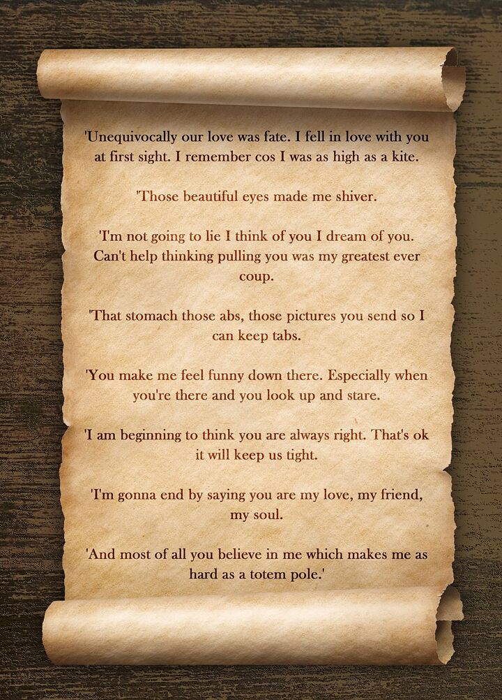 'I am beginning to think you are always right. That's ok it will keep us tight. I'm gonna end by saying you are my love, my friend, my soul. And most of all you believe in me which makes me as hard as a totem pole.'