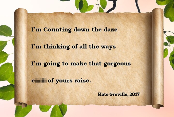 It was sent in response to a poem from Ms Greville in which she wrote: 'You make my heart flutter because you are a nutter. Every day you do me proud not just because you are well endowed.'