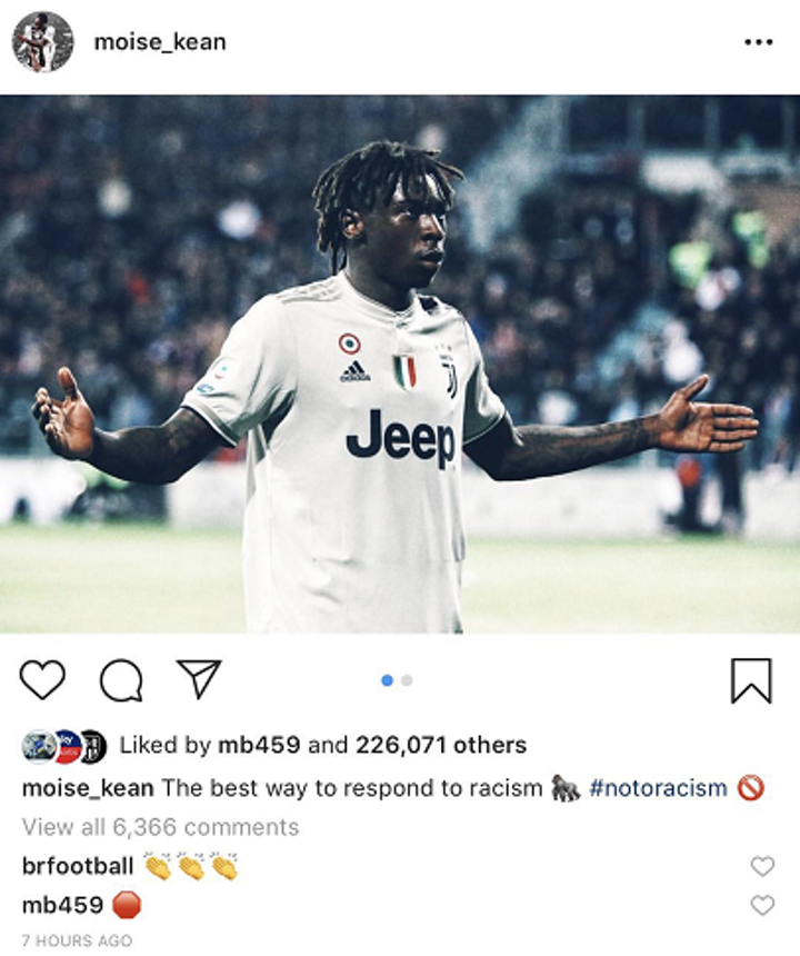 Juventus and Italy star Moise Kean confirms his goal celebration against Cagliari was “the best way to respond to racism.”