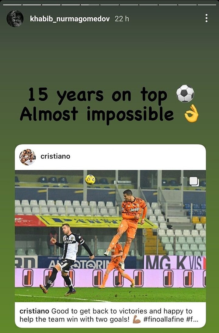 And after Ronaldo scored twice for Juventus against Parma on Saturday, Khabib said: '15 years at the top. Almost impossible' on his Instagram story next to an image of the footballer.