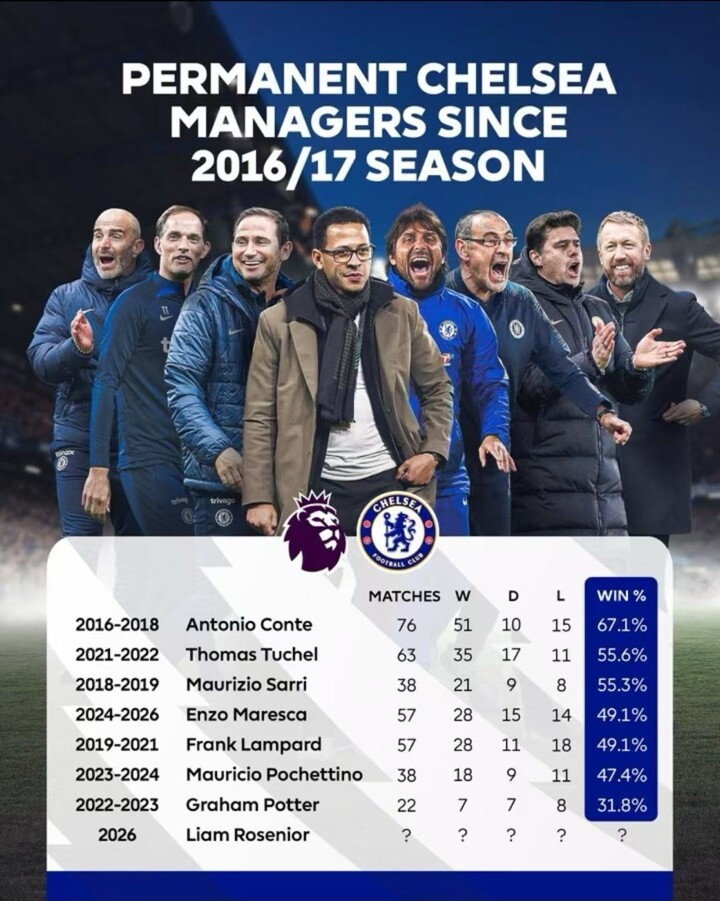 The Premier League has officially compiled a ranking of Chelsea's managers by their win rates over the past decade.
