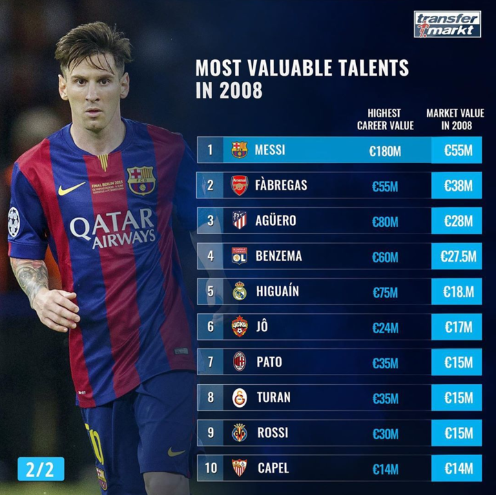 Messi is the most valuable talent in 2008 with his market value reaching up to €55m.