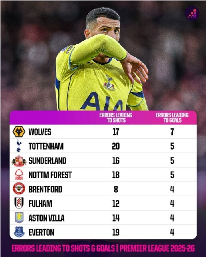 In the 16th round of the Premier League last weekend, Tottenham Hotspur lost 0-3 to Nottingham Forest. Archie Gray's turnover in the backfield led to the team conceding a goal. According to statistics, Tottenham Hotspur have conceded goals due to mistakes five times in the Premier League this season.