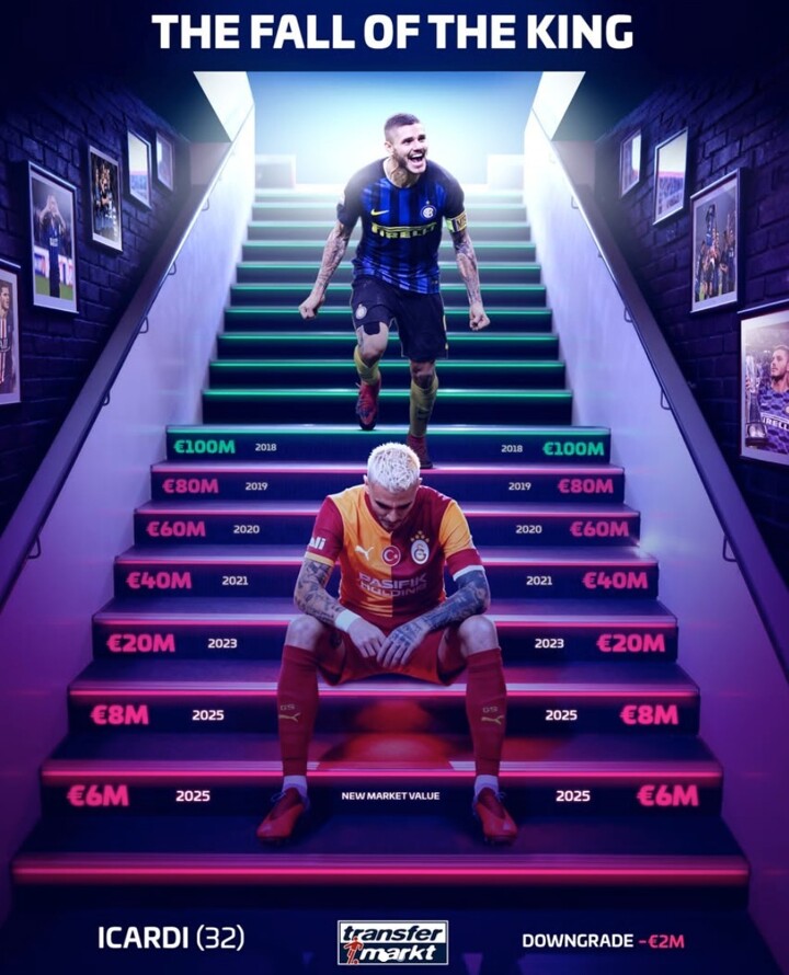 Transfermarkt has updated the market values of players in the Turkish Super League. Currently playing for Galatasaray, Mauro Icardi's market value has further declined, now standing at only 6 million euros.
