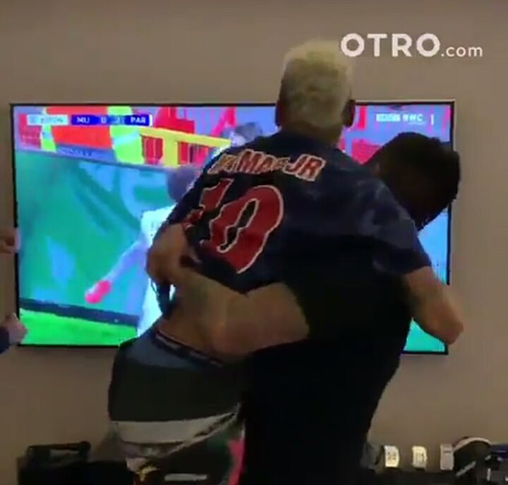 Neymar celebrates PSG's goals against Man United with friends in Paris