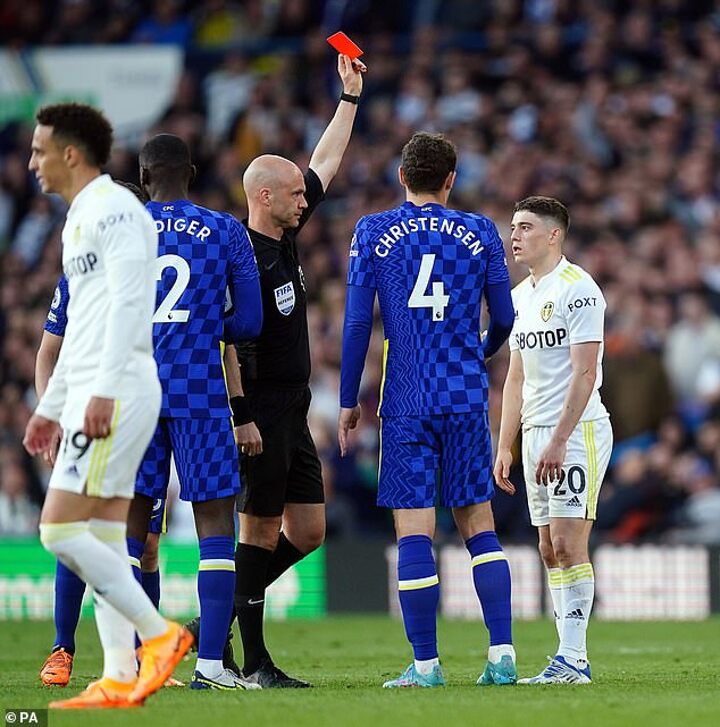 Dan James became the second Leeds player to be shown a straight red card in successive weeks after his shocking tackle on Chelsea midfielder Mateo Kovacic, who is now a major doubt for the FA Cup final as a result of the crunching challenge.