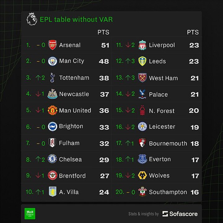However, it would mean that the gap between the two teams is reduced from five to three. The Gunners are just one point better off with VAR in place.