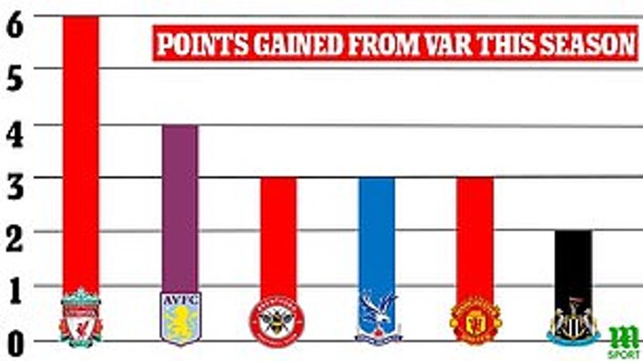West Ham would also have three points more without VAR, while Brighton and struggling Everton would have two additional points.