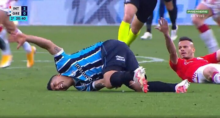 The official obliges and shows Internacional's Rene a yellow card, before cameras cut to show Suarez laughing from the floor.