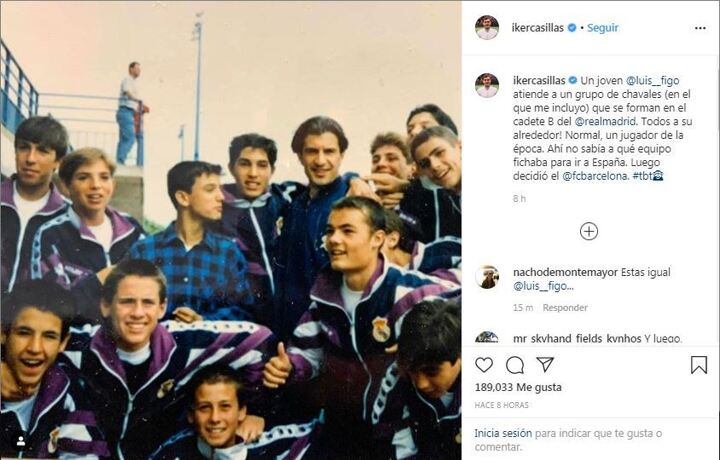 The photo, posted on Instagram, shows Figo surrounded by the Cadete B team at Real Madrid, including the likes of Casillas, David Aganzo, Javier Portillo and Oscar Minambres.