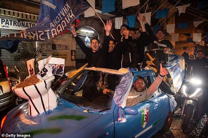 Thousands flooded into the main square of Naples at Piazza Plebiscito waving flags and banners, with many climbing up lamp posts and up onto balconies in their exuberance.