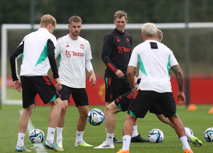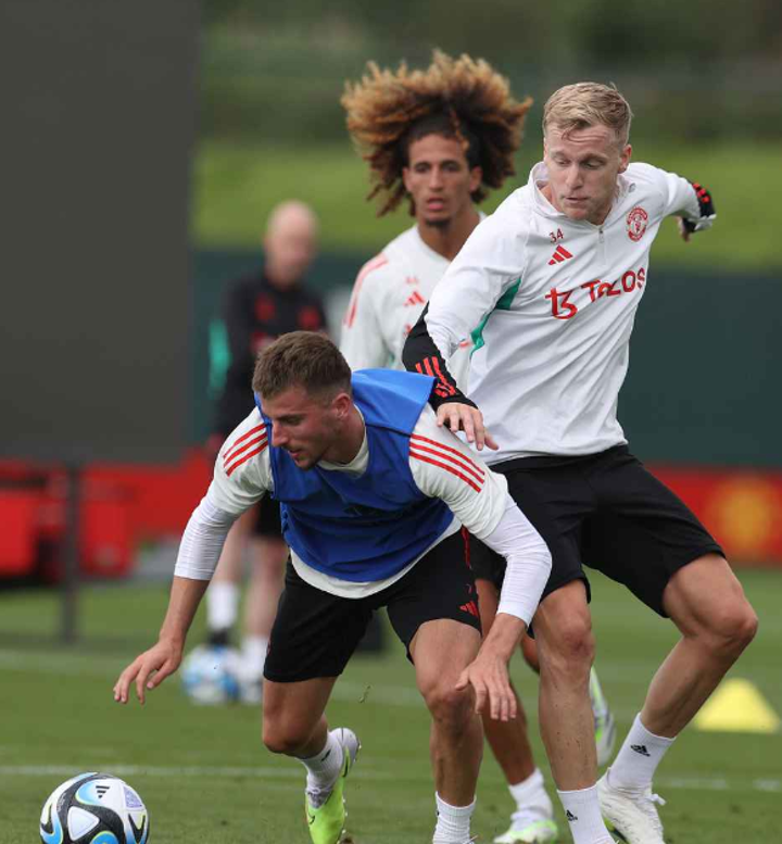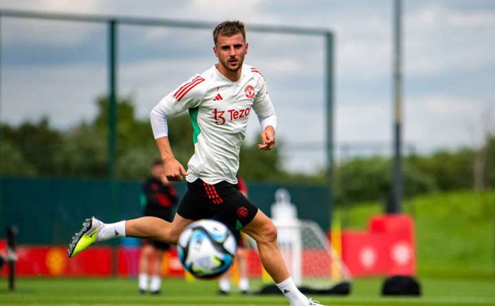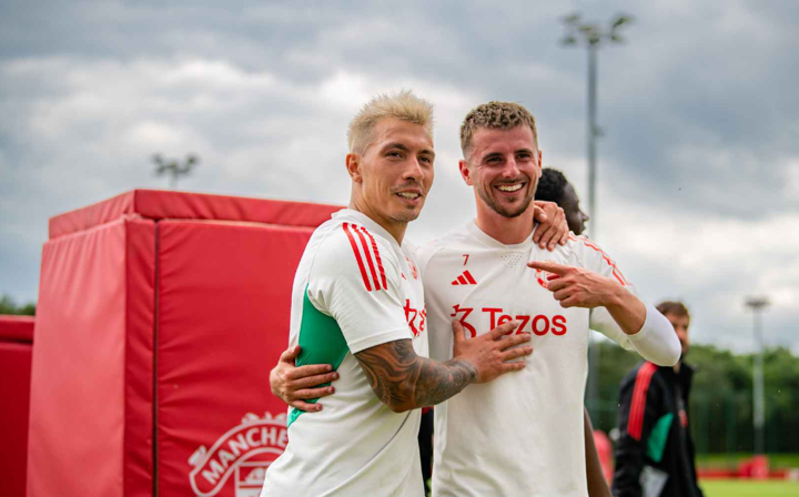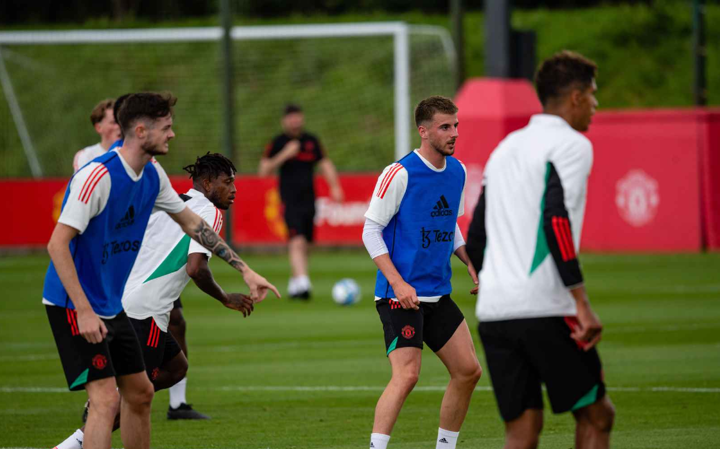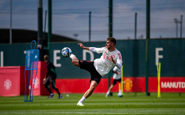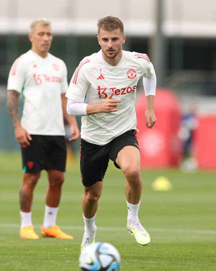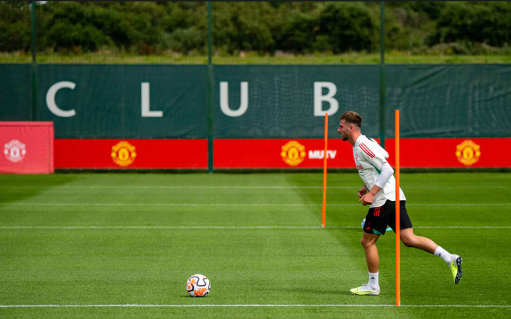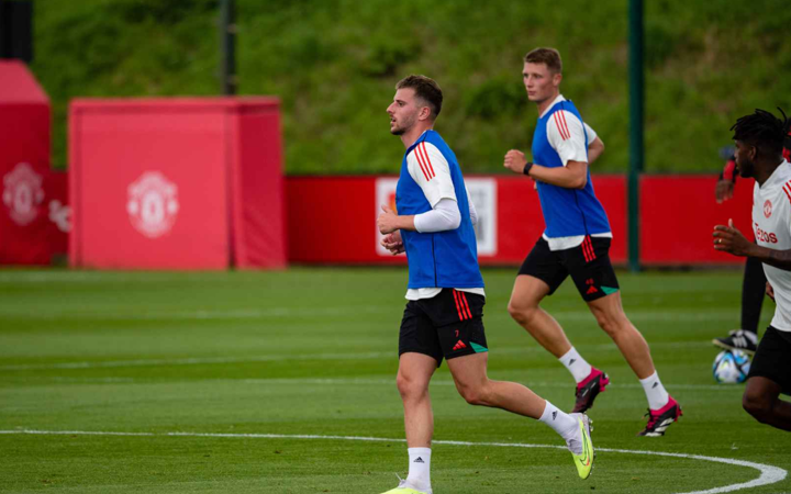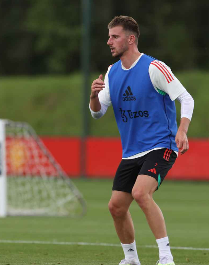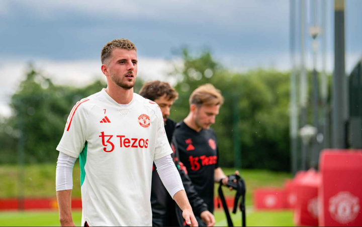 Mason Mount has been pictured taking part in his first training session at Manchester United after confirming his transfer from Chelsea earlier this week.