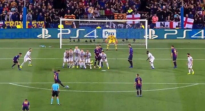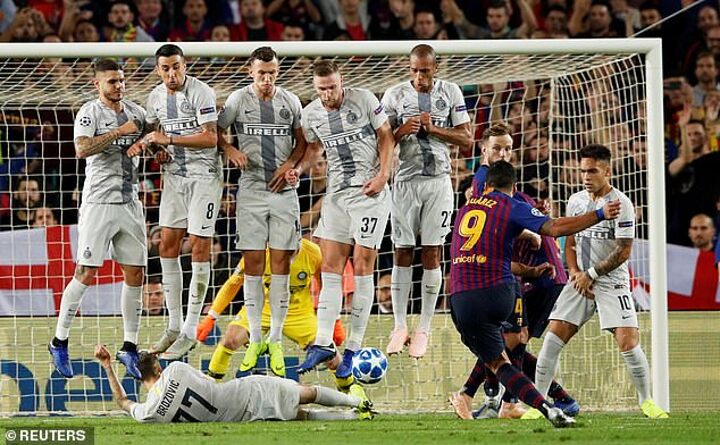 The striker attempted to trick the Inter wall by drilling his shot low along the ground and underneath their feet as they jumped in anticipation of an attempt through the air.