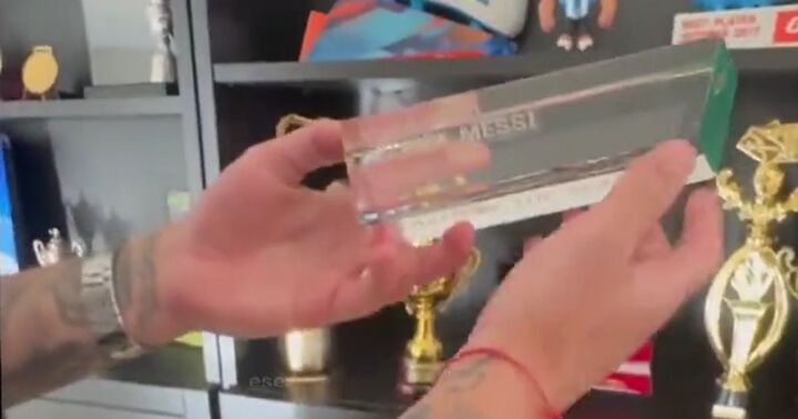 As he showed them his wall of awards and memorabilia, including a ball from the Qatar World Cup signed by all of his victorious team-mates, the journalist was shocked to discover Messi's La Liga 2020/21 Best Player award on the shelf.