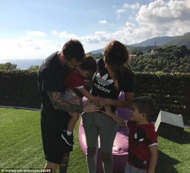 Roccuzzo took to Instagram last month to announce to the world she was pregnant with her third child, posting a picture of showing herself, Messi and their two sons touching her stomach alongside the caption: 'Family of 5. Blessed.'
