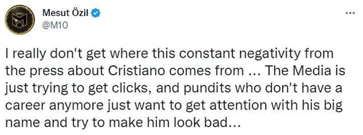 In a post on social media, Ozil wrote: 'I really don't get where this constant negativity from the press about Cristiano comes from... The Media is just trying to get clicks, and pundits who don't have a career anymore just want to get attention with his big name and try to make him look bad...