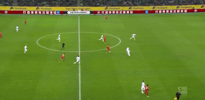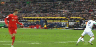Bensebaini is allowed to take a full run-up in anticipation of Hofmann’s corner-kick.