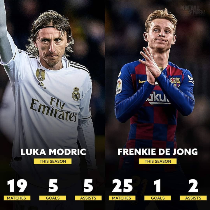 So far this season, 34-year-old Modric has been involved in 10 goals (5 goals and 5 assists) in 19 apps in all competitions, 7 more than Barca's €75m signing Frenkie De Jong, who has just 1 goal and 2 assists in 25 apps.