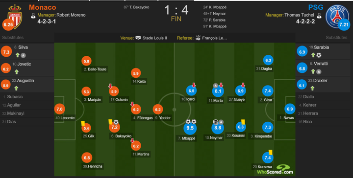 We bring you the player ratings for Monaco vs PSG as Martial is Man of the Match with a rating of 7.9.