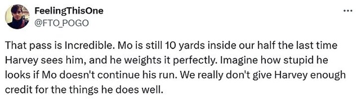 Analysing the goal, one fan replied to the clip stating: 'That pass is Incredible. Mo is still 10 yards inside our half the last time Harvey sees him, and he weights it perfectly.