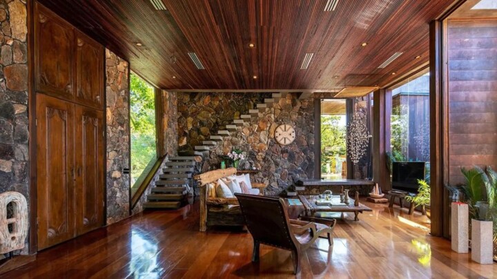 While its grounds feature a main Indonesian-style villa with two master suites and a koi fish pond and three sea-view bungalows.