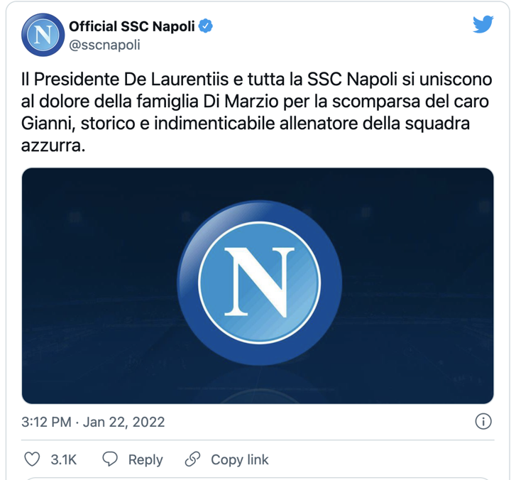 Napoli paid tribute to Di Marzio in a post on their Twitter page, which reads: “President De Laurentiis and the entire SSC Napoli team join the Di Marzio family in mourning the passing of dear Gianni, the Azzurri’s historic and unforgettable coach.”