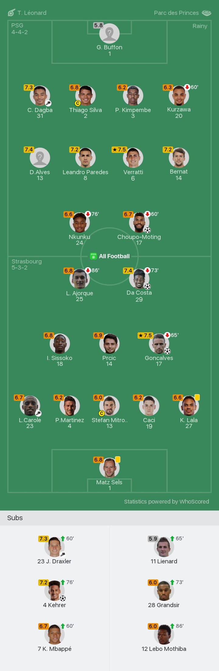 We bring you the player ratings for PSG vs Strasbourg as Verratti becomes Man of the Match with a rating of 7.5.