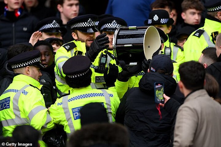 Police officers were pictured wading into the Crystal Palace end at the Emirates Stadium and were pictured confiscating a drum from the away supporters, ahead of the Eagles' Premier League clash against Arsenal.