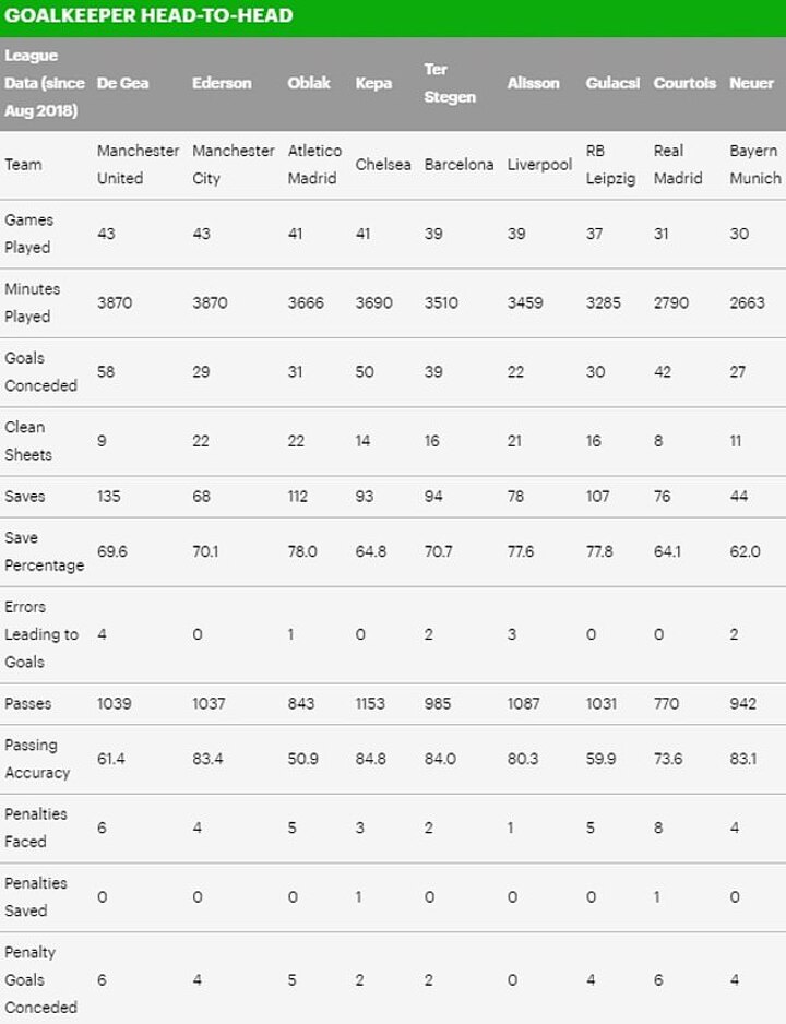 Meanwhile Liverpool's No 1 Alisson has a lower save percentage of 77.6 per cent in the Premier League, as does Manchester City's Ederson (70.1 per cent) and Manchester United's David de Gea (69.6 per cent) as well as Bayern's Neuer (62 per cent) in the Bundesliga.