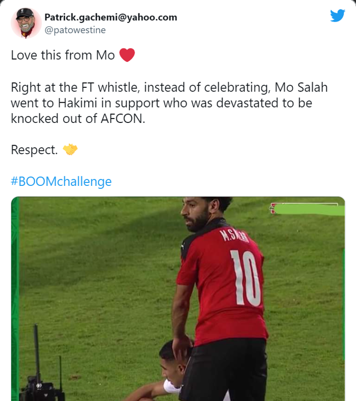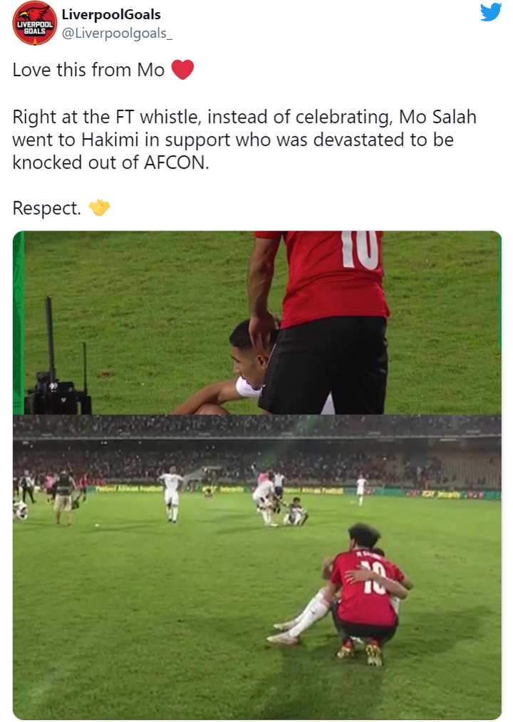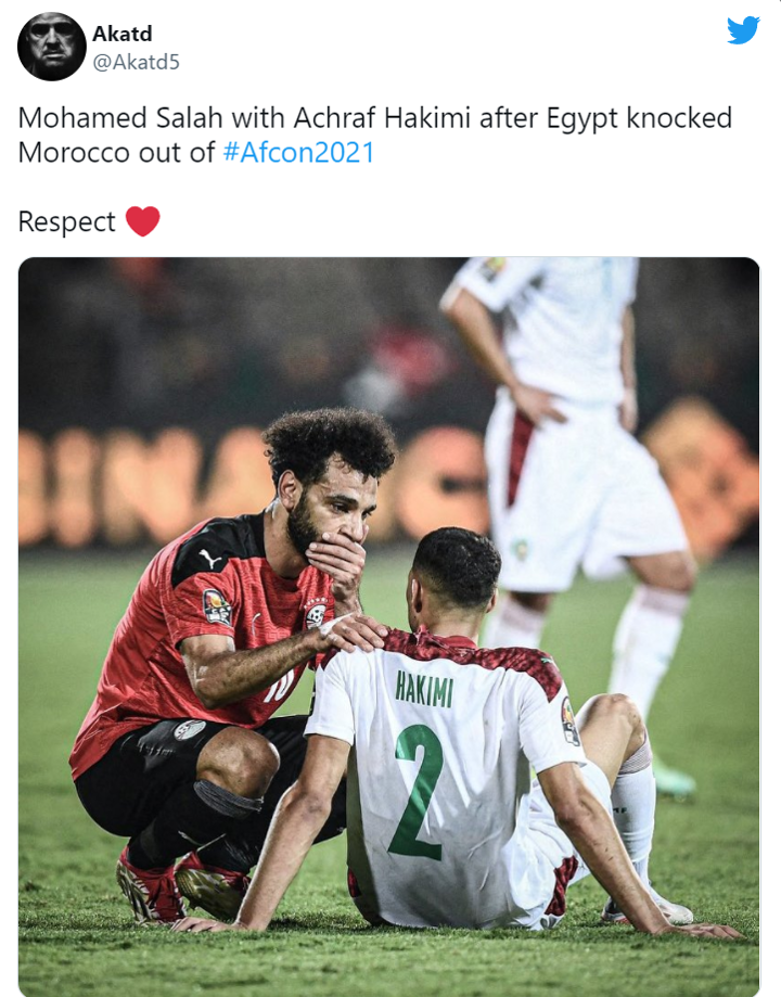 Egyptian captain Mohamed Salah has been hailed by fans after his act of consoling Achraf Hakimi after the Africa Cup of Nations quarter-final game on Sunday.