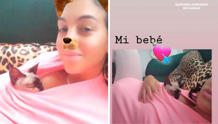 Cristiano Ronaldo's girlfriend Georgina Rodriguez cradled her pet cat under her top in a new post which is likely to lead to fresh pregnancy speculation.