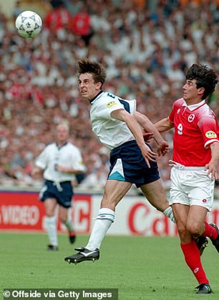 By the summer of 1996 Neville had already established himself as first-choice right back for club and country, playing every minute for England until the semi-final defeat by Germany - which he was suspended for. He would go on to earn 85 caps for England, the last of which came in 2007, and win 16 major trophies in a one-club career with United - who he would go on to captain before his career ended 2011.