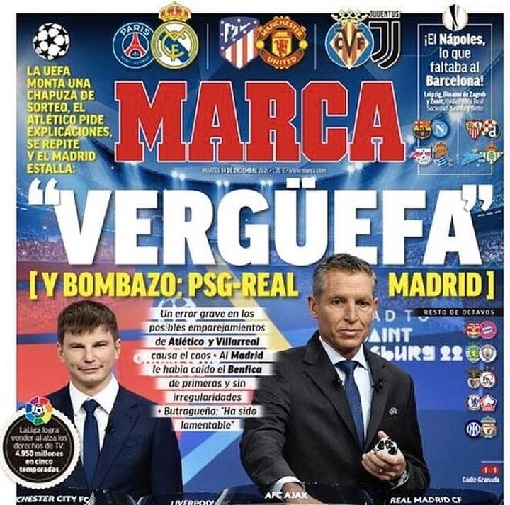 Newspaper Marca has used the word 'Shame' on Tuesday morning's front page, to describe UEFA's error in making the draw.