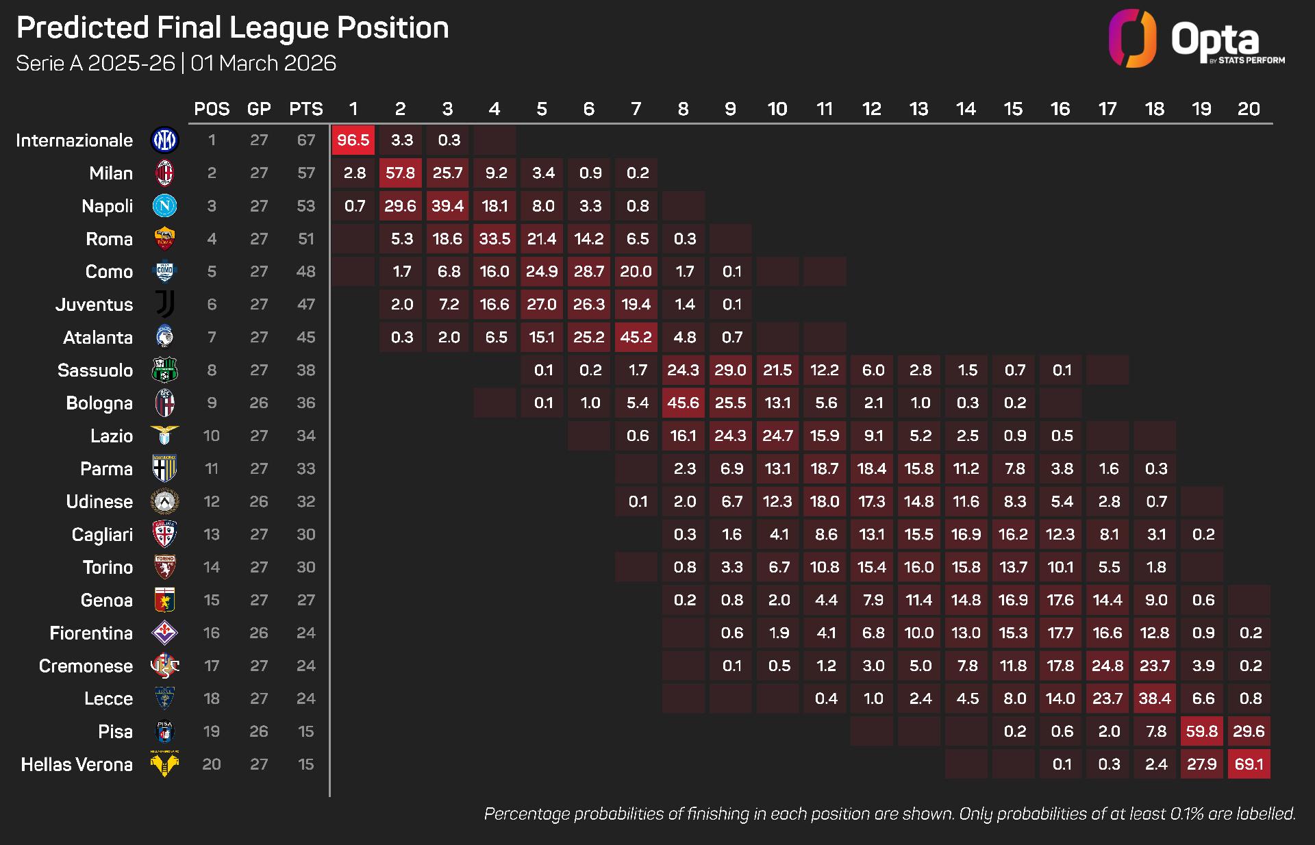 Juventus are assigned a 25.8% chance of finishing in the top four, with Roma (57.4%) and Napoli (69.7%) all better fancied in the Opta supercomputers season simulations, while Como (24.5%) and Atalanta (8.8%) are also in with a shout.