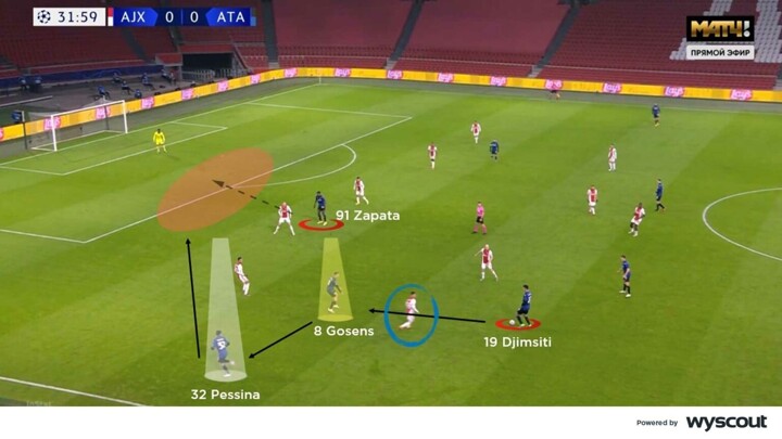 These two players' positions create two possible passing lines for the ball-carrier: one on the inside and one on the outside. The movement of the pressing player helps to decide which option the ball-carrier chooses. In this case, Djimsiti, chooses to pass to Gosens. Pessina then makes a third-man run in behind the defence, while Duván Zapata does the same centrally.