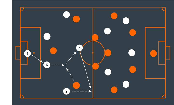 Alternatively, a player can take up a position between the lines to receive the first pass. They then move the ball to another player who has moved on the blindside of an opponent (below).