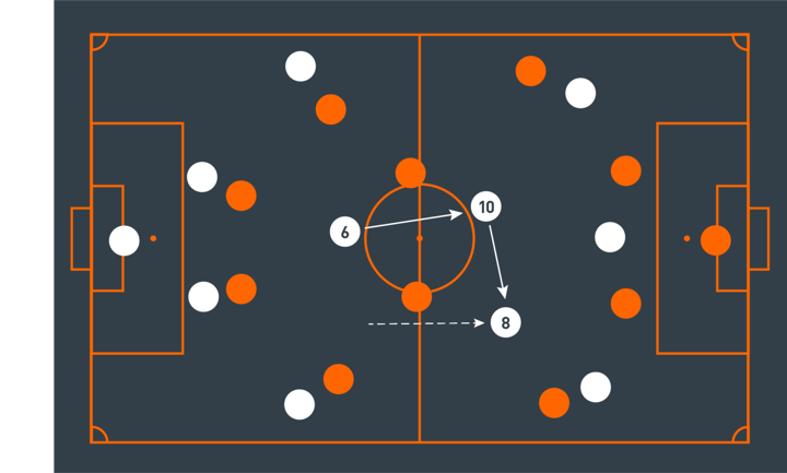 For third-man runs to work, a player must first draw an opponent out of position by moving forward with the ball (above). Once an opponent has moved out to engage the ball-carrier, a teammate can move into the space they have vacated. A pass can then be played to another nearby teammate, who can then find the teammate who has moved into this gap in the opposition's structure.