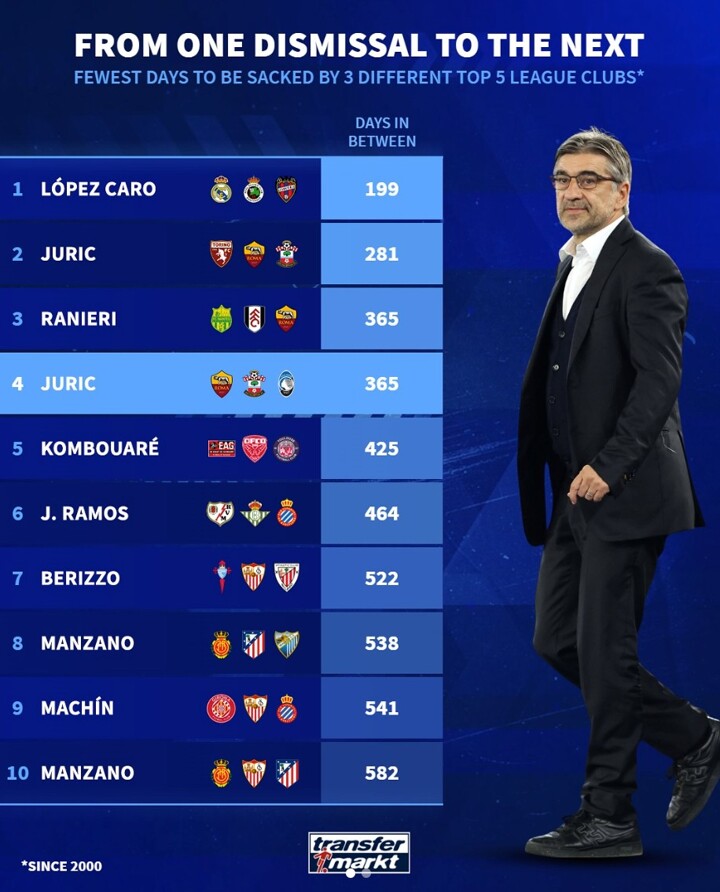 Former Real Madrid manager Lopéz Caro ranked first with 199 days, while Ivan Juric appeared on the list twice.