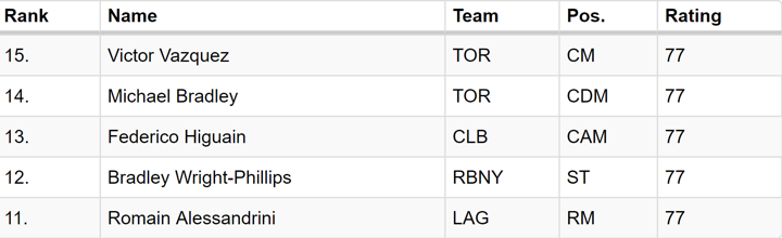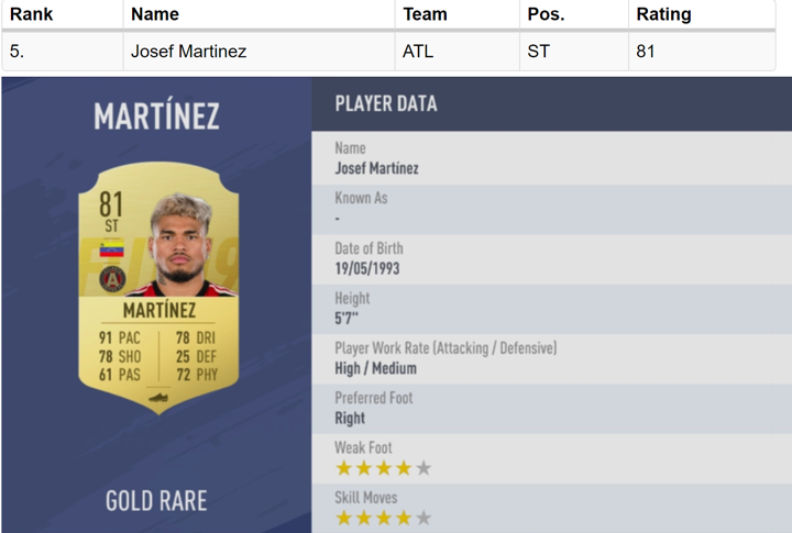 MLS' record breaker, Martinez comes in at fifth in the league to kick off FIFA 19. With 29 goals and counting, Martinez gets a deserved boost from the 76 he started with last season. His card will be a must for any MLS team with his pace, skill moves and weak foot. An added bonus: high work rate.