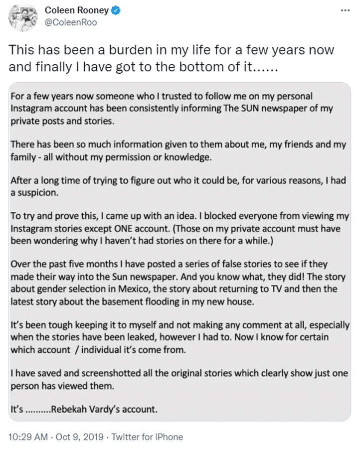 Coleen also told the High Court she 'had suspicions' that Rebekah's Instagram account was responsible for leaking information to journalists when she unfollowed her on the social media site.