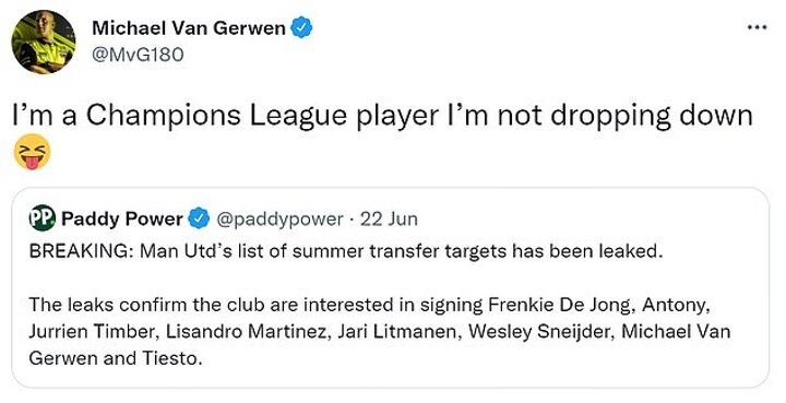 The three-time PDC World Champion took to Twitter to poke fun at United and suggest that he is too high a calibre of player to join ten Hag's side, insisting that he is a 'Champions League player'.