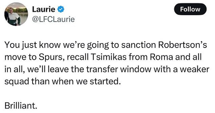 One supporter posted: 'You just know we're going to sanction Robertson's move to Spurs, recall Tsimikas from Roma and all in all, we'll leave the transfer window with a weaker squad than when we started it. Brilliant.'