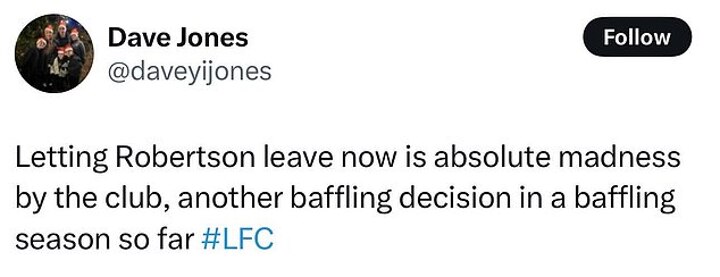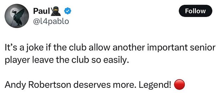 One fan posted on X: 'Letting Robertson leave now is absolute madness by the club, another baffling decision in a baffling season so far.'