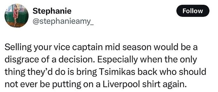 Another wrote: 'Selling your vice captain mid season would be a disgrace of a decision. Especially when the only thing they'd do is bring Tsimikas back who should not ever be putting on a Liverpool shirt again.'
