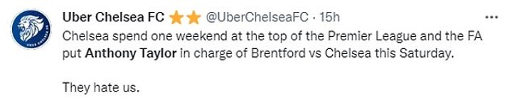 Another user posted: 'Chelsea spend one weekend at the top of the Premier League and the FA put Anthony Taylor in charge of Brentford vs Chelsea this Saturday. They hate us.'