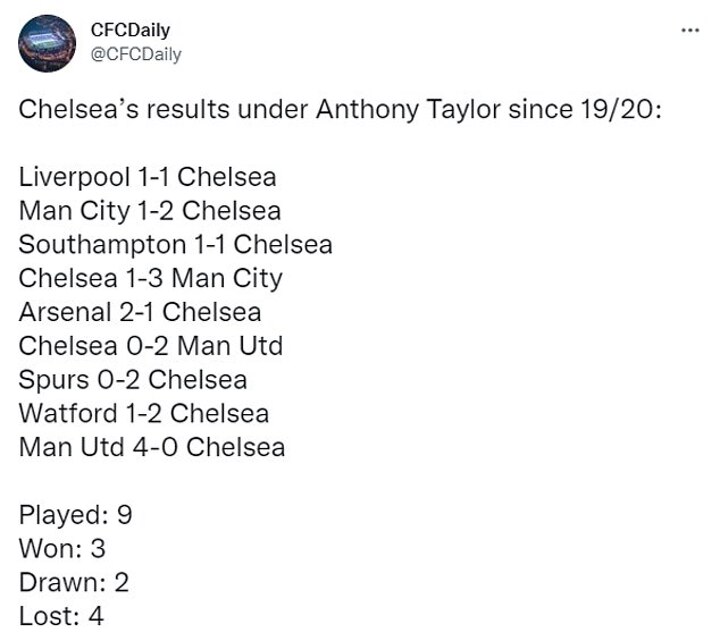 It comes just six weeks after Chelsea fans started a petition to get Taylor banned from refereeing their matches after the official sent off Reece James and awarded Liverpool a penalty during their clash at Anfield.
