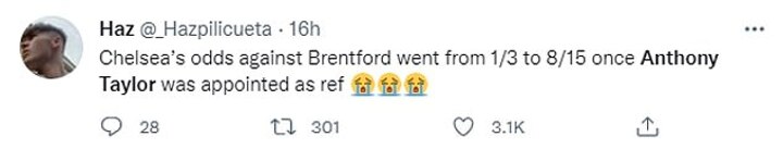 @_Hazpilicueta agreed, commenting: 'Chelsea’s odds against Brentford went from 1/3 to 8/15 once Anthony Taylor was appointed as ref'.