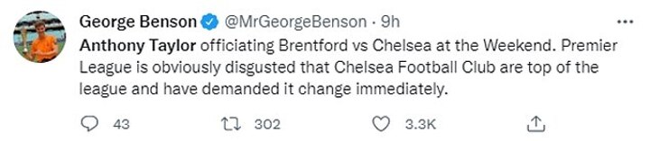 @MrGeorgeBenson added: 'Anthony Taylor officiating Brentford vs Chelsea at the Weekend. Premier League is obviously disgusted that Chelsea Football Club are top of the league and have demanded it change immediately.'